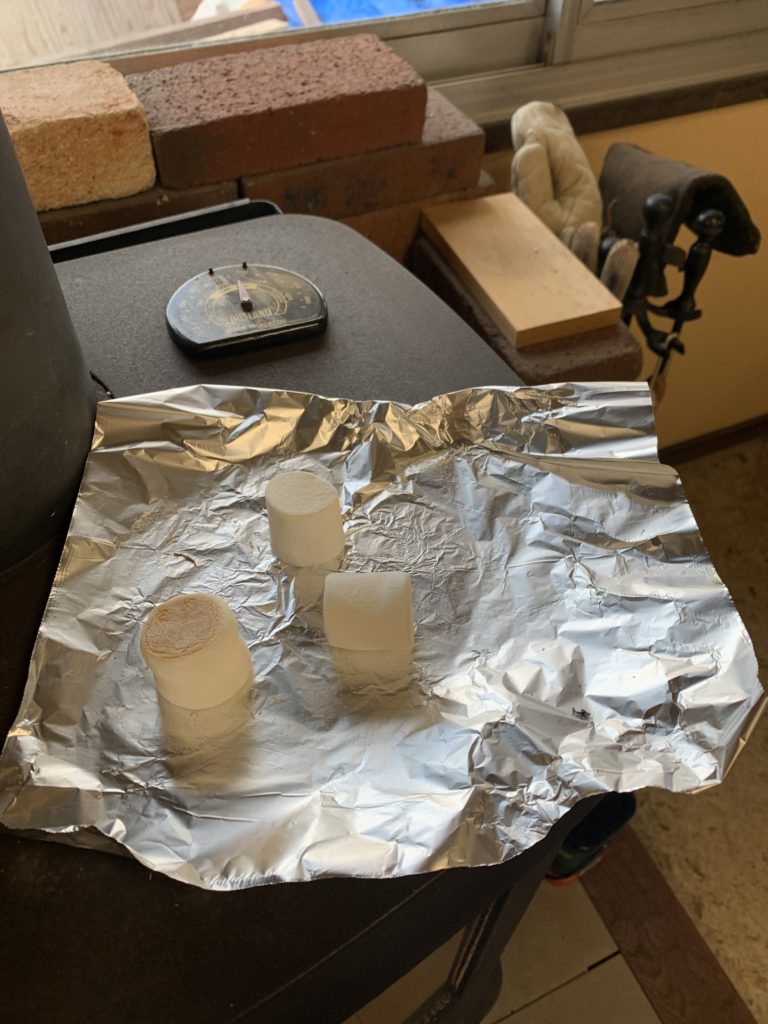 薪ストーブの中に入れてあぶると、一瞬で溶けてうまく焼けません。