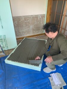 部屋の寸法が普通の間取りより広かったため、100mmの断熱材を部屋全面に圧着